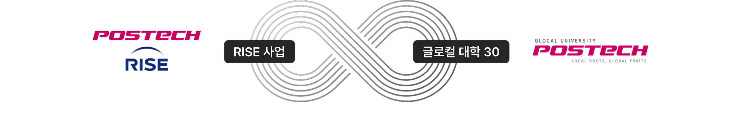 무한대 기호 형태의 연결 고리를 통해 RISE 사업과 글로컬 대학 30이 POSTECH을 중심으로 상호 유기적으로 연계되어 추진됨을 나타냄.